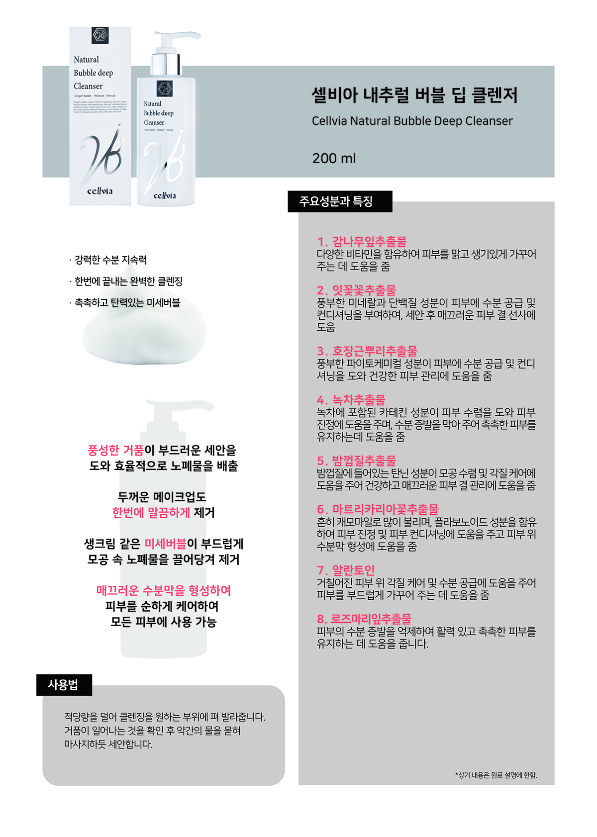 정제수, 데실글루코사이드, 라우라마이드디이에이, 아크릴레이트코폴리머, 부틸렌글라이콜, 메틸퍼플루오로부틸에터, 메틸퍼플루오로아이소부틸에터, 코카미도프로필베타인, 트라이에탄올아민, 글리세린, 감나무잎추출물, 잇꽃꽃추출물, 호장근뿌리추출물, 녹차추출물, 밤껍질추출물, 라벤더꽃추출물, 마트리카리아꽃추출물, 로즈마리잎추출물, 스타아니스추출물, 노니추출물, 소듐하이알루로네이트, 사이클로펜타실록세인, 1,2-헥산다이올, 카프릴릴글라이콜, 사이클로헥사실록세인, 소듐클로라이드, 카보머, 에틸헥실글리세린, 알란토인, 폴리쿼터늄-7, 데실알코올, 다이소듐이디티에이, 글루코오스, 소듐벤조에이트, 향료, 리모넨 |