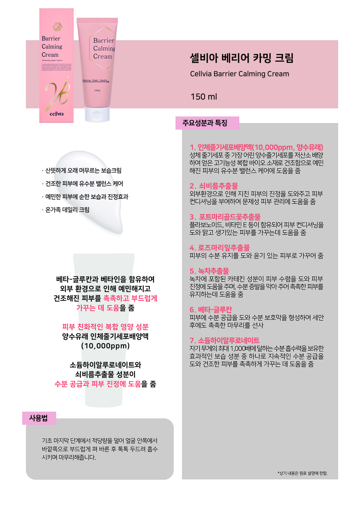 정제수, 글리세린, 아이소노닐아이소노나노에이트, 부틸렌글라이콜, 카프릴릭/카프릭트라이글리세라이드, 세틸에틸헥사노에이트, 1,2-헥산다이올, 아라키딜알코올, 인체줄기세포배양액(10,000ppm,양수유래), 세테아릴알코올, 소듐하이알루로네이트, 글루코오스, 베타-글루칸, 쇠비름추출물, 포트 마리골드꽃추출물, 녹차추출물, 로즈마리잎추출물, 트레할로오스, 폴리글리세릴-3메틸글루코오스다이스테아레이트, 비즈왁스, 베헤닐알코올, 폴리 글리세릴-6스테아레이트, 소듐아크릴레이트/소듐아크릴로일다이메틸타우레이트코폴리머, 아라키딜글루코사이드, 폴리아이소부텐, 베타인, 팔미틱 애씨드, 스테아릭애씨드, 에틸헥실글리세린, 폴리글리세릴-6베헤네이트, 다이소듐이디티에이, 카프릴릴/카프릴글루코사이드, 솔비탄올리에이트 |
