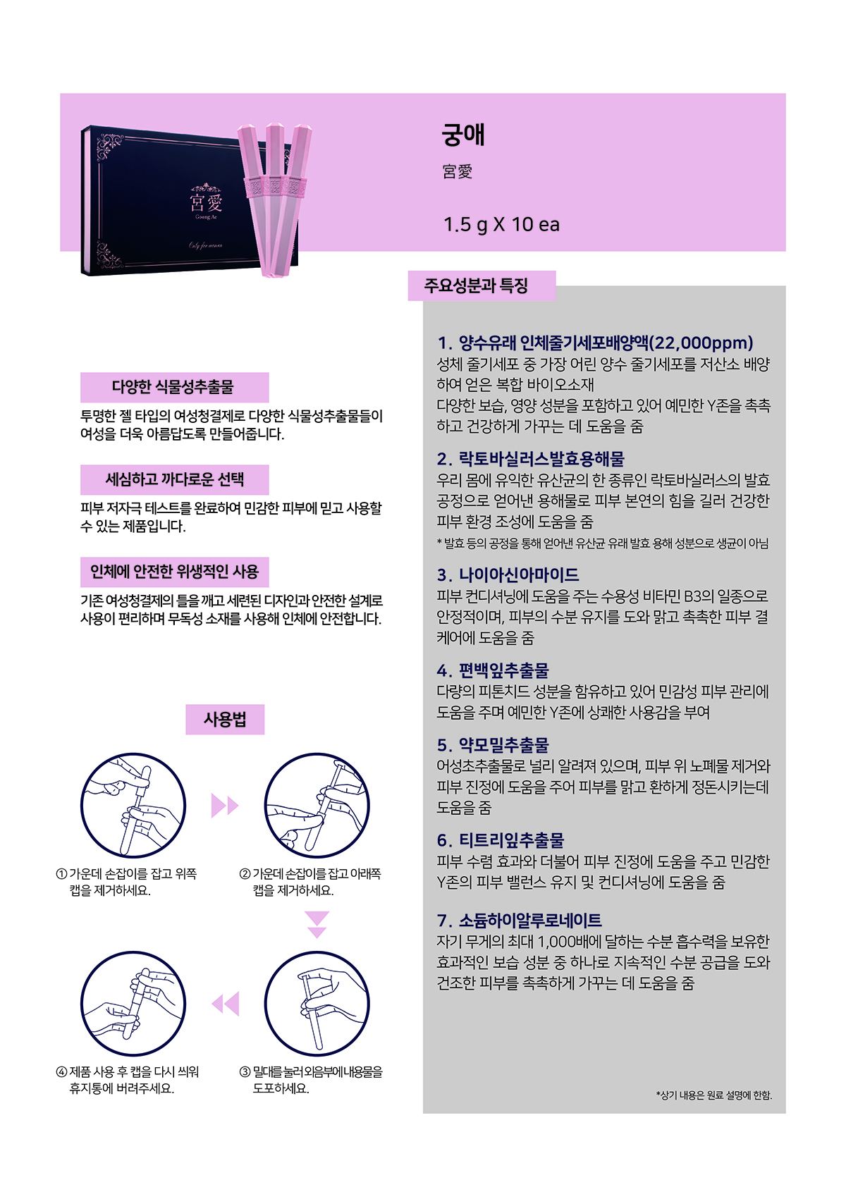 정제수, 부틸렌글라이콜, 글리세린, 인체줄기세포배양액(22,000ppm, 양수유래), 나이아신아마이드, 1,2-헥산다이올, 하이드록시에틸셀룰로오스, 베타인, 하이드록시아세토페논, 덱스판테놀, 다이포타슘글리시리제이트, 시트릭애씨드, 에틸헥실글리세린, 잔탄검, 알란토인, 소나무추출물, 병풀추출물, 포트마리골드꽃추출물, 녹차추출물, 로즈마리잎추출물, 아데노신, 다이소듐이디티에이, 쑥잎추출물, 사철쑥잎추출물, 불가리스쑥추출물, 락토바실러스발효용해물, 소듐하이알루로네이트, 베타-글루칸, 티트리잎추출물, 콘민트잎추출물, 고삼뿌리추출물, 편백잎추출물, 약모밀추출물, 시베리안잎갈나무목부추출물, 크리산텔룸 인디쿰추출물, 장엽대황뿌리/줄기추출물, 개양귀비꽃추출물, 참나무뿌리추출물, 여뀌추출물, 스타아니스추출물, 조선현호색뿌리추출물, 황련뿌리추출물, 요엽후박나무껍질추출물, 글라이신, 세린, 글루타믹애씨드, 아스파틱애씨드, 류신, 알라닌, 라이신, 알지닌, 타이로신, 페닐알라닌, 트레오닌, 프롤린, 발린, 아이소류신, 히스티딘, 메티오닌, 시스테인 |